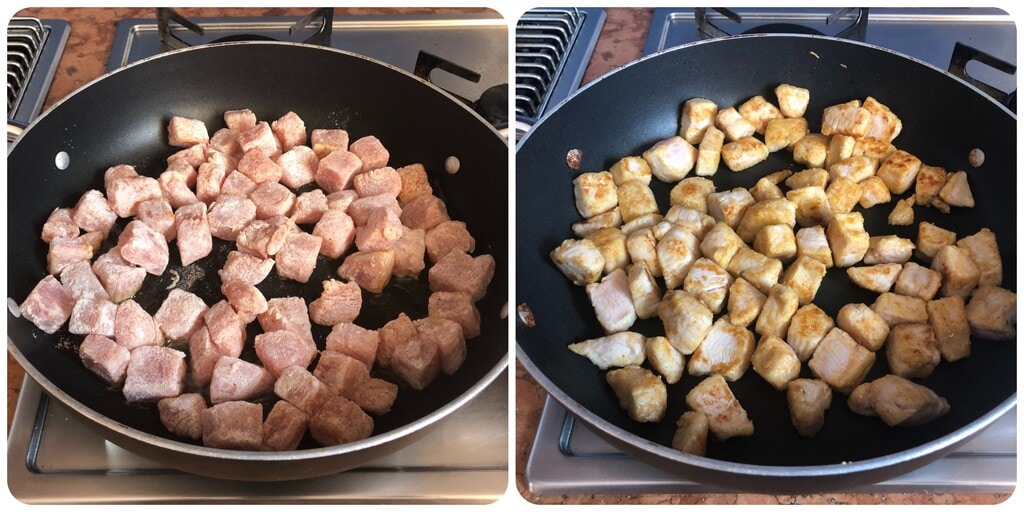 Verhit een paar eetlepels olie in een pan voordat je de met bloem bedekte vleesblokjes toevoegt. Bak ze 5 minuten op hoog vuur en roer regelmatig. Ze moeten uiteindelijk mooi goudbruin zijn. Haal ze uit de pan, voeg een beetje zout toe en zet ze apart.