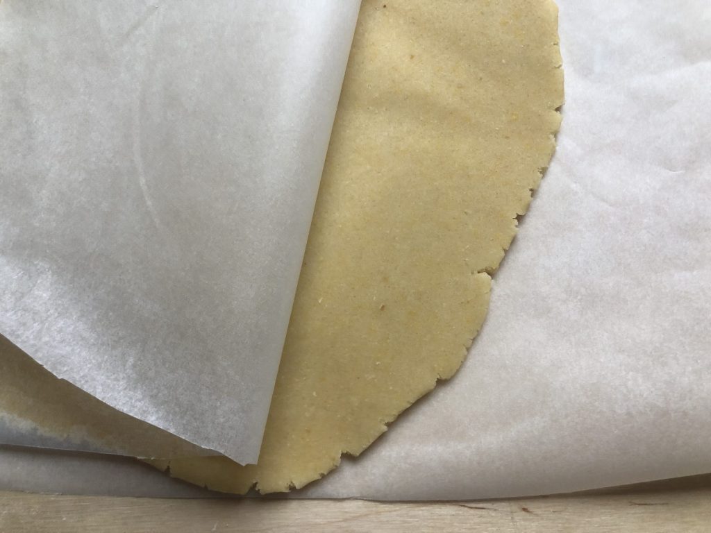 Na de rusttijd leg je het deeg tussen twee vellen bakpapier en rol je het uit tot een dikte van 3-4 mm.