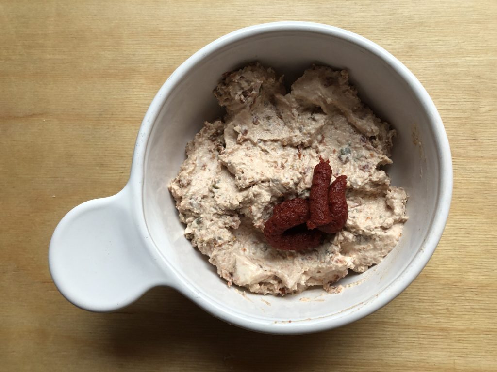 Doe de verkregen crème in een klein schaaltje en voeg de tomatenpuree toe. Ik deed het niet meteen in de mengkom om de tint rood beter te kunnen regelen, maar als je wilt, kun je het samen met de andere ingrediënten pureren.
