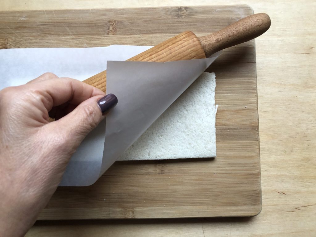 Leg een plak wit sandwichbrood op een snijplank, dek af met een vel bakpapier en rol er zachtjes met de deegroller overheen (slechts één of twee keer). Het brood mag niet worden platgedrukt, maar alleen lichtjes gecompacteerd. Dit zorgt ervoor dat we scherpere randen krijgen en voorkomt dat het brood breekt wanneer we het proberen uit te steken met de uitsteker.