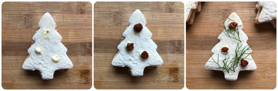 Gebruik de punt van een tandenstoker om her en der wat stipjes mayonaise op het oppervlak aan te brengen: dat zal dienen als eetbare lijm. Leg er dan een klein stukje rode tomaat op, omgetoverd tot een bolletje. Versier ten slotte met enkele venkelgroen voor een idee van de takjes van de boom.