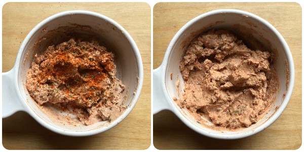 Breng de crème op smaak met paprika en een snufje oregano. Je kunt de paprika naar smaak doseren afhankelijk van je persoonlijke voorkeur. Meng goed en breng op smaak met zout, indien nodig. Proef omdat gedroogde tomaten en kappertjes al behoorlijk smaakvol zijn.