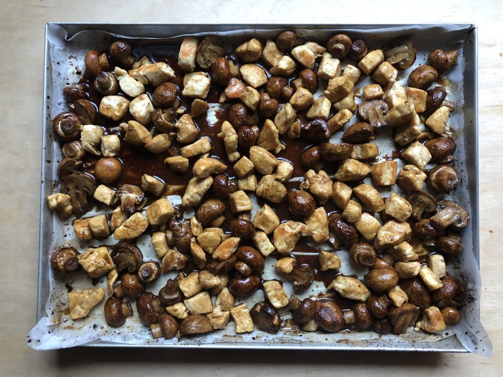 • Voeg ten slotte de kipstukjes toe aan de champignons, roer goed door en bak nog 10 minuten op 200°.