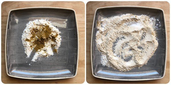 Haal vervolgens de plakjes kipfilet door het mengsel en schud ze lichtjes om overtollige bloem te verwijderen.