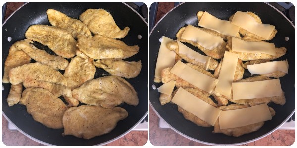 Zodra de kip bijna gaar is, zout en peper toevoegen en de kaasplakjes erop leggen.