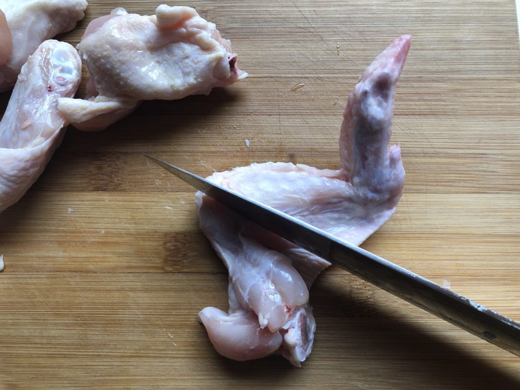 Was de kippenvleugels, dep ze droog met keukenpapier en snijd ze in twee delen op het punt waar ze buigen.