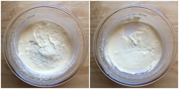 Voeg dan ook de geraspte kokos toe en verzacht het mengsel met de kokosmelk.
