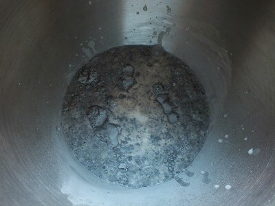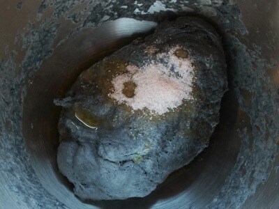 • Giet de zwarte bloem met actieve kool in de kom van de keukenmachine en voeg het mengsel van water en gist toe.
