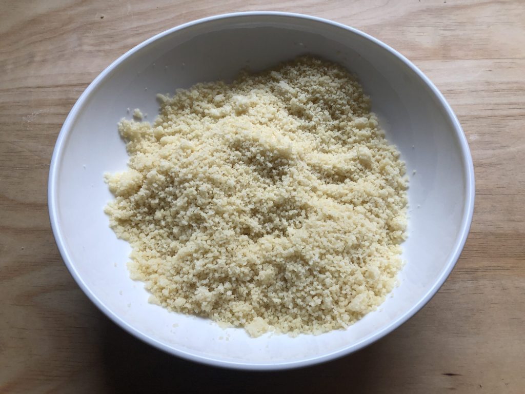 Kook de couscous in een brede braadslede volgens de aanwijzingen op de verpakking. Ik deed 250 ml water in een braadslede, voegde zout toe, een eetlepel olie en bracht het aan de kook. Vervolgens voegde ik de couscous toe en zette het vuur uit. Ik liet het de vloeistof absorberen voor ongeveer 3/4 minuten, terwijl ik het met een houten lepel losmaakte. Daarna voegde ik een paar noten boter toe, zette het vuur weer aan en kookte het op zeer laag vuur nog 3/4 minuten onder af en toe roeren.