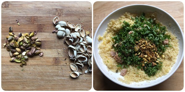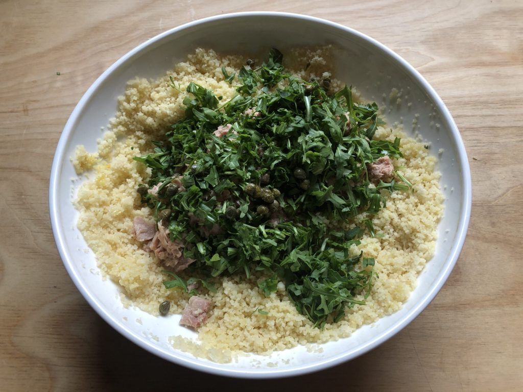 Laat de tonijn uitlekken, verkruimel het met een vork en voeg het toe aan de inmiddels afgekoelde couscous.