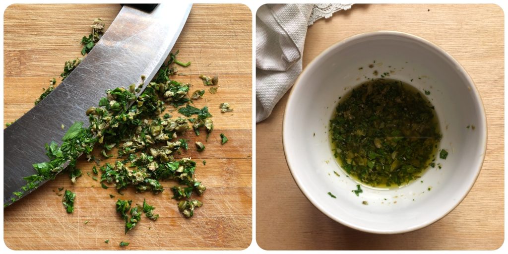 • Maak ondertussen de saus door simpelweg de ontzoute kappertjes fijn te hakken met wat peterselie en ze te mengen met een paar eetlepels olie.