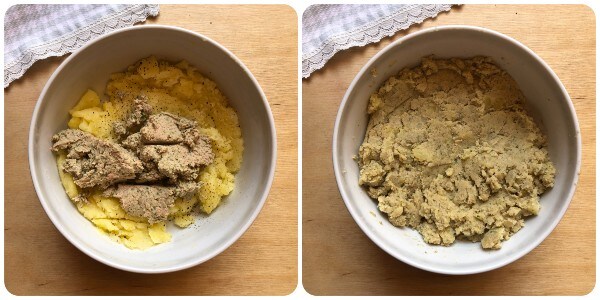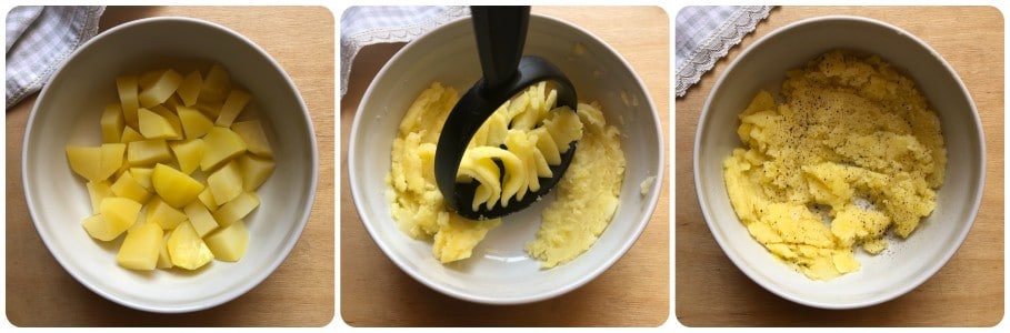 • Schil de aardappelen, was ze en snijd ze in blokjes (ze koken sneller). Kook ze in gezouten water tot ze zacht zijn. Als alternatief kunt u de magnetron gebruiken zoals ik deed. In dat geval zet ze in een glazen kom zonder ze te drogen en voeg een extra eetlepel water toe. Dek ze af en kook ze 4/5 minuten op de hoogste stand (900W). Giet ze vervolgens af, doe ze in een kom en prak ze met een stamper of een vork. Breng op smaak met zout en peper naar wens en laat ze afkoelen.