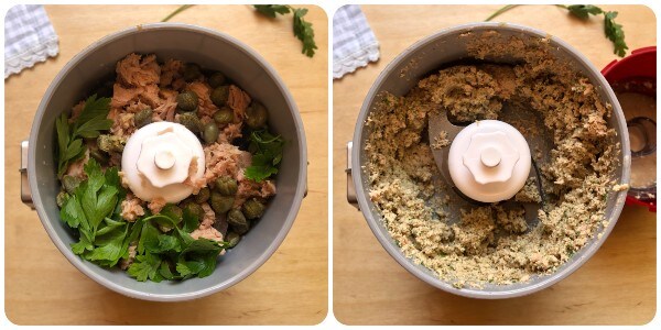 • Ontzout de kappertjes onder stromend water en droog ze door ze te deppen met keukenpapier. Doe ze vervolgens in een hakmolen samen met de tonijn (uitgelekt uit de conserveringsolie) en een paar peterselieblaadjes. Hak alles grof.