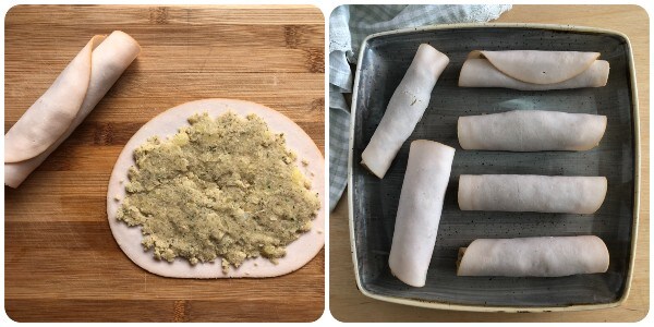 • Verspreid de zo verkregen vulling over de plakjes gebraden kalkoen in een gelijkmatige laag, rol vervolgens elk plakje op tot een rolletje. Zet in de koelkast om af te koelen.