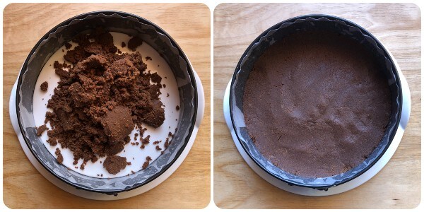 Bekleed de bodem en zijkanten van een springvorm met een diameter van 22 cm met bakpapier. Ik heb alleen de bodem ingevet omdat mijn vorm een keramische basis heeft die het uiteindelijke serveerbord wordt. Alternatief kun je de ring van de vorm op een bord plaatsen omdat de taart niet gebakken hoeft te worden.
