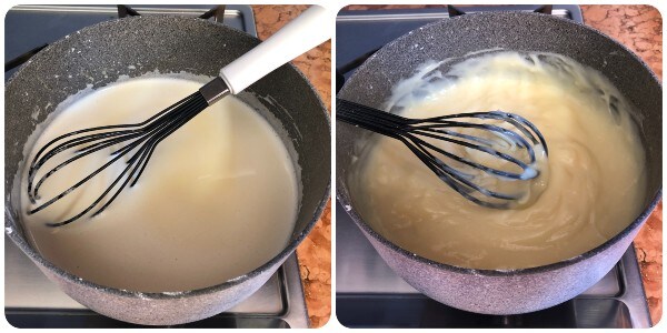 Zet de steelpan op het vuur en kook de room op een laag vuur gedurende ongeveer tien minuten, voortdurend roerend met de garde: je zult geleidelijk zien dat het begint in te dikken.