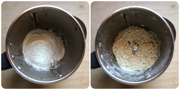 • Giet nu het water, de gist en de suiker in de mengkom en meng (30 seconden, 37°, snelheid 2). Als je de Thermomix niet gebruikt, gebruik dan lauwwarm water.