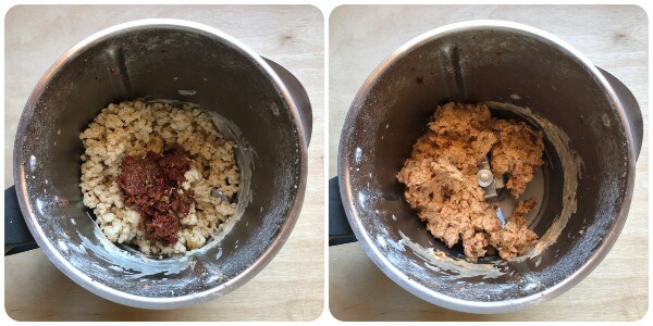 • Doe de gedroogde tomaten en de kappertjes in de mengkom en hak ze fijn (twee seconden op snelheid 7, dan het mengsel naar het midden van de kom schrapen en de handeling herhalen). Haal het mengsel uit de kom en zet het apart.