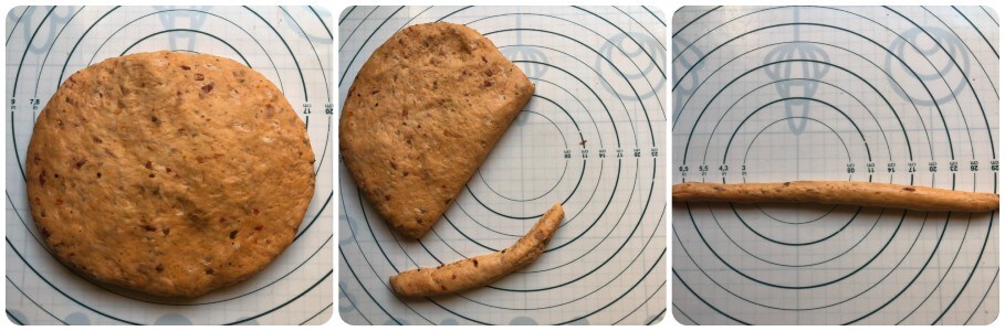 • Na het rijzen, het deeg platdrukken, reepjes snijden en met de handen uitrollen tot grissini.