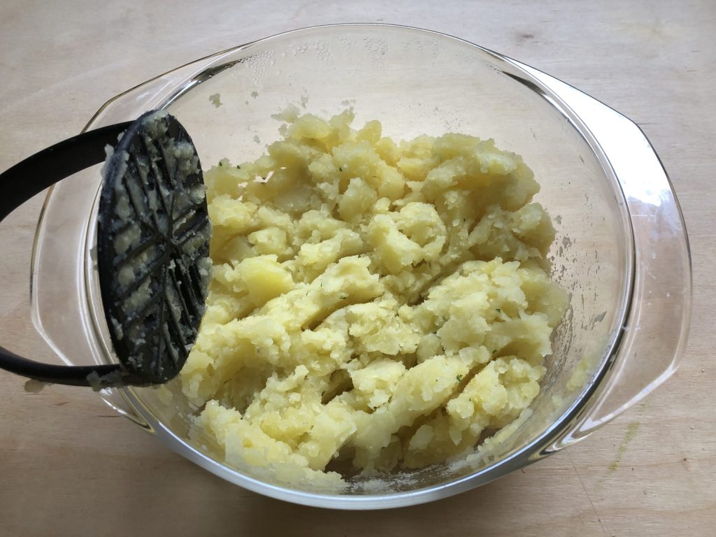 • Plet de aardappelen zonder ze te veel te breken. Ik heb ze niet volledig tot een puree verwerkt, maar ik heb wat grove stukjes overgelaten. Om deze reden heb ik geen traditionele aardappelstamper gebruikt. Voeg vervolgens zout naar smaak toe.