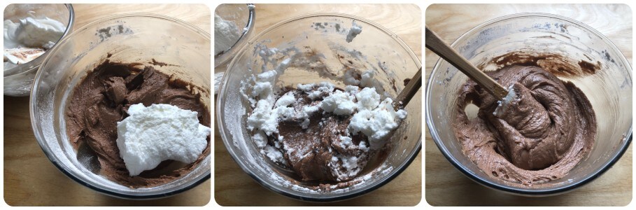 En tot slot, voeg in meerdere keren de opgeklopte eiwitten toe door ze voorzichtig met opwaartse bewegingen te mengen om te voorkomen dat het mengsel inzakt. Het moet een romig mengsel worden. Als het te stijf is, voeg dan een beetje melk toe (ik hoefde dat niet te doen).