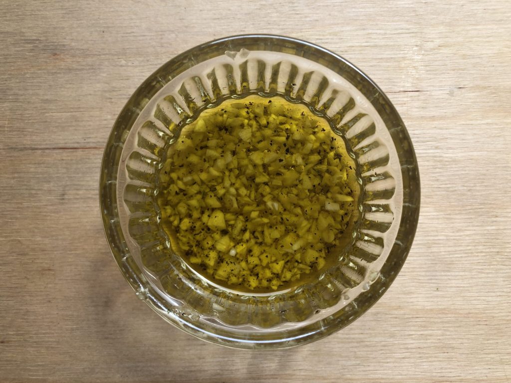 Pel een teentje knoflook, verwijder de kern en hak het fijn. Doe het in een klein kommetje, voeg de olie, een snufje zout en een flinke draai zwarte peper toe en meng. Laat dit mengsel staan tot het gebruikt wordt voor het bakken. Als je niet van knoflook houdt, kun je het weglaten en alleen met olie, zout en peper bestrijken.