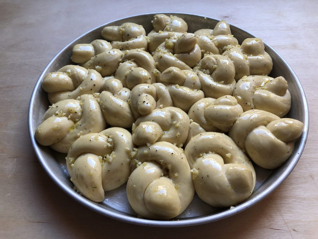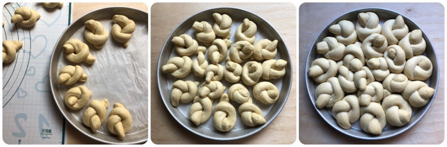 Leg de knopen in de eerder voorbereide bakvorm, dek af met een schone doek en laat het nog twee uur rijzen.