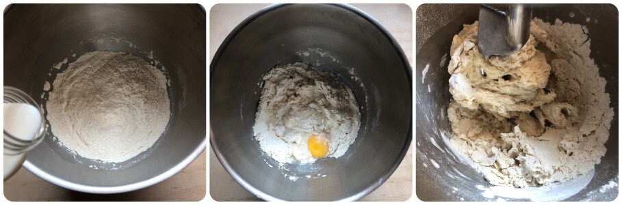 Voeg vervolgens de melk en het ei toe en begin te kneden met de deeghaak.