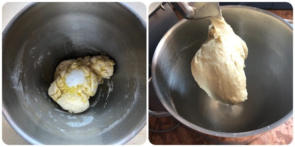 Wanneer het deeg samenkomt, voeg dan ook de olie en het zout toe en blijf kneden totdat je een glad en homogeen deeg hebt dat aan de haak hecht.