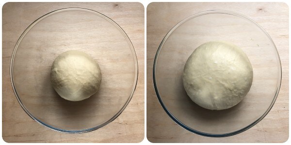 Leg het op het werkblad en kneed het een paar momenten met je handen en vorm een bal. Plaats het dan in een grote kom, dek het af met plasticfolie en laat het rijzen tot het volume verdubbeld is op een warme plaats, beschermd tegen tocht. De rijstijd is, zoals altijd, afhankelijk van de omgevingstemperatuur en kan variëren van twee tot drie uur.