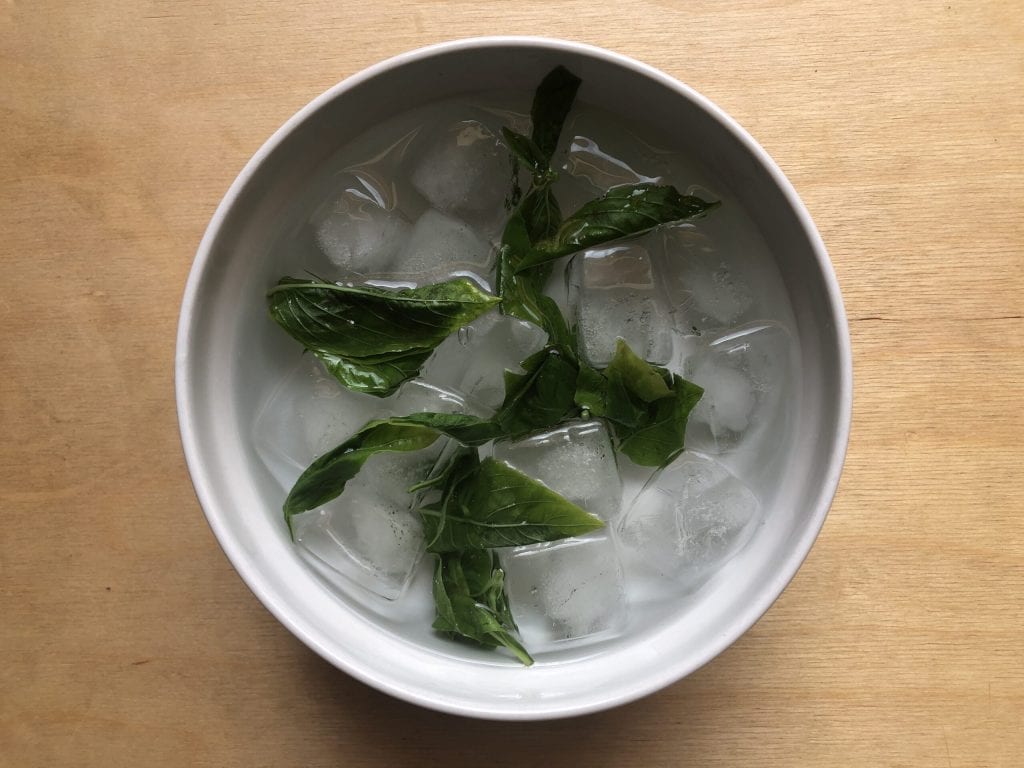 • Was de basilicumblaadjes en blancheer ze 10 seconden (niet langer) in licht gezouten water. Dit trucje inacteert het enzym dat verantwoordelijk is voor oxidatie en dus voor het zwart worden van de basilicum. Bovendien fixeert het de chlorofyl, waardoor een mooie heldergroene kleur behouden blijft.