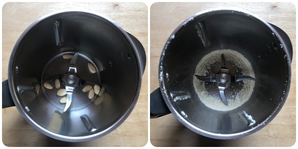 • Doe de amandelen in de mengkom en hak ze fijn gedurende 10 seconden op snelheid 8, haal ze dan uit de kom en zet apart.