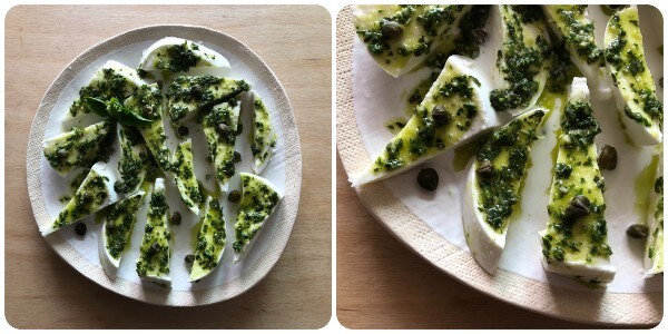 • Leg de partjes op de serveerschaal en breng ze op smaak met de basilicum- en amandelsaus. Voeg hier en daar wat ontzoute kappertjes toe en breng het meteen naar de tafel. Geniet ervan! Paola