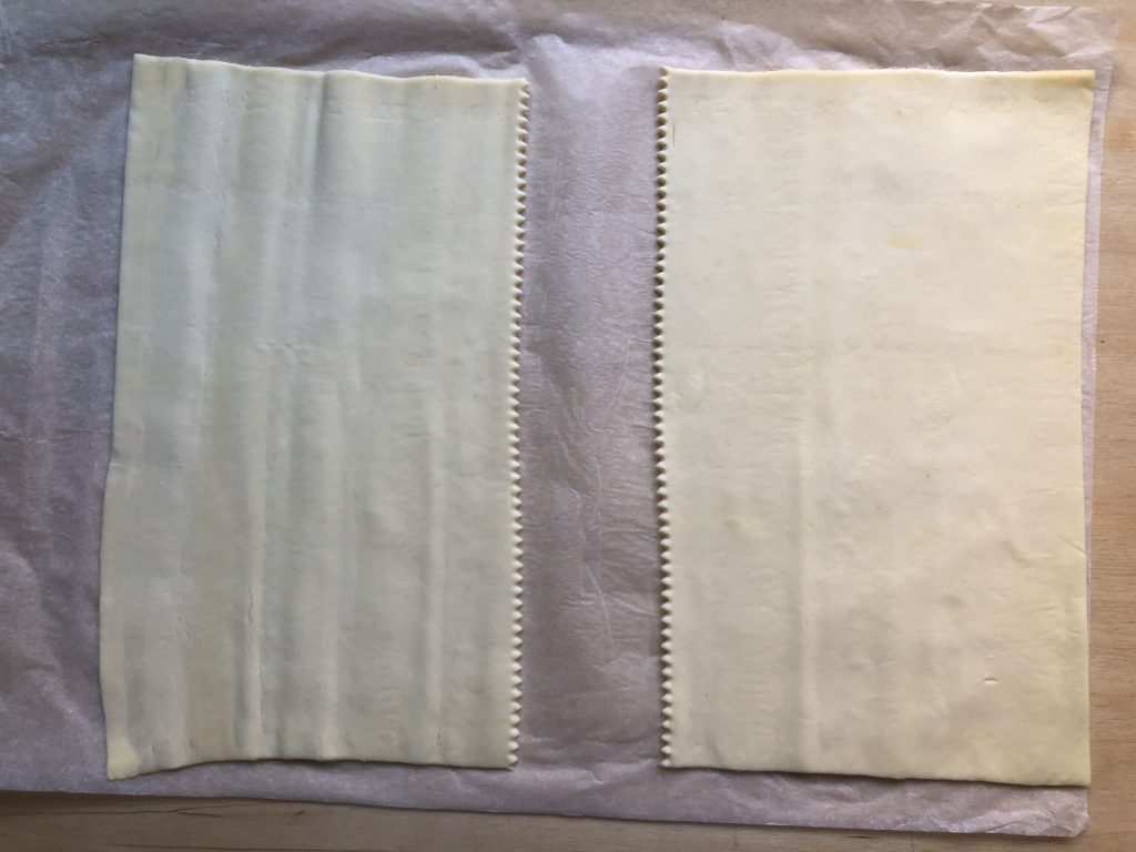 Rol het rechthoekige bladerdeeg uit, terwijl je het op het bakpapier laat liggen dat bij de verpakking is geleverd. Rol er voorzichtig overheen met de deegroller en snijd het vervolgens doormidden met een getand wieltje.