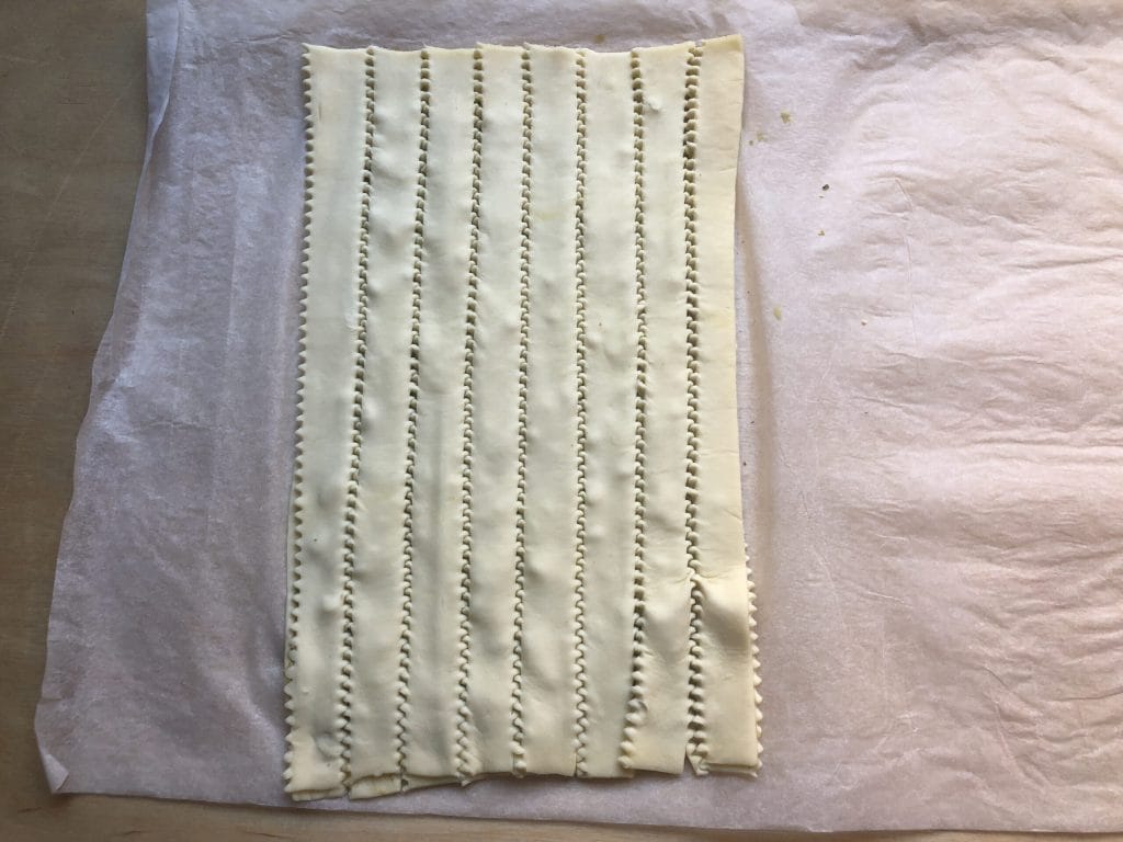 Gebruik nu opnieuw het getande wieltje om stroken van 2 cm breed te snijden, beginnend vanaf de korte zijde van de rechthoek.