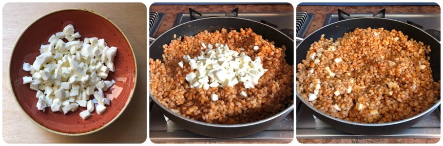 Snijd de mozzarella in stukjes, voeg deze toe aan de andere ingrediënten en ga door met koken totdat de kaas is gesmolten.