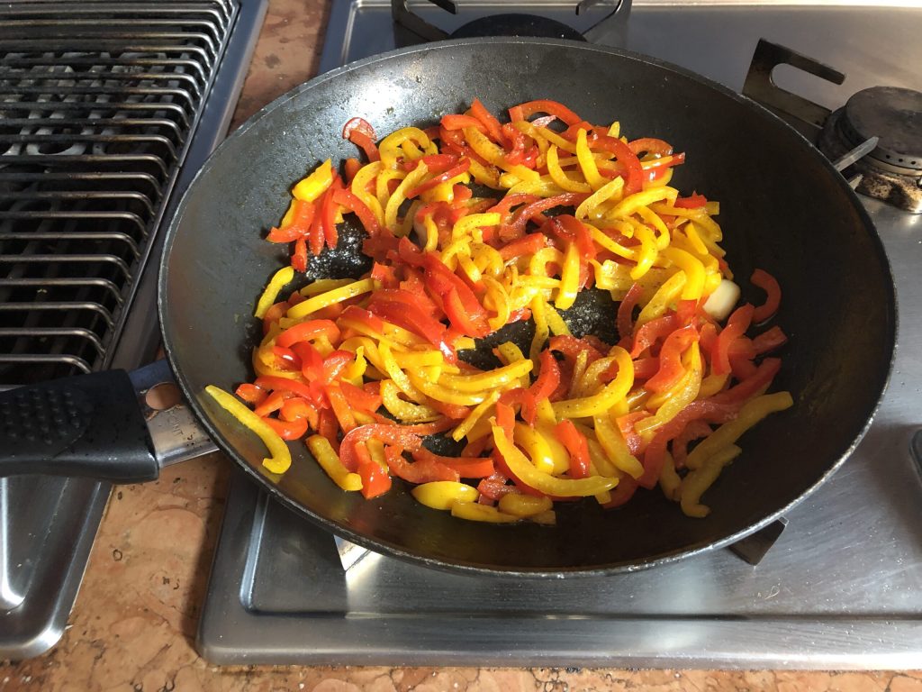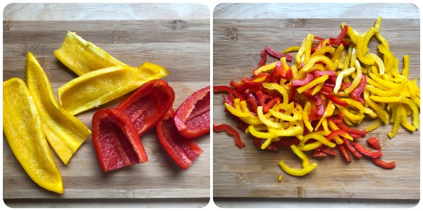 Reinig de twee paprika’s door de steel en alle zaden en witte filamenten binnenin te verwijderen. Snijd ze in stukken, was ze en dep ze droog met keukenpapier. Snijd ze vervolgens in dunne reepjes.