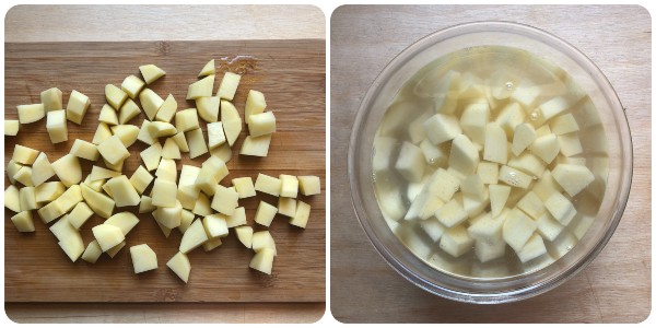 Schil de aardappelen, was ze en snijd ze in niet te grote blokjes. Doe ze vervolgens in een kom, bedek met koud water en laat ze minstens 20 minuten weken.