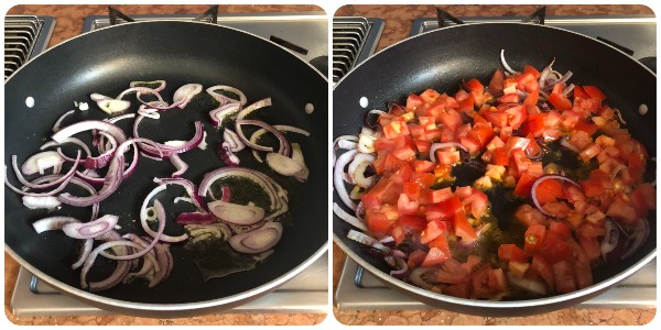 Verhit in een ruime pan een paar eetlepels olie voordat je de ui toevoegt. Fruit de ui een paar minuten, voeg dan de tomaten en een royale snuf zout toe.