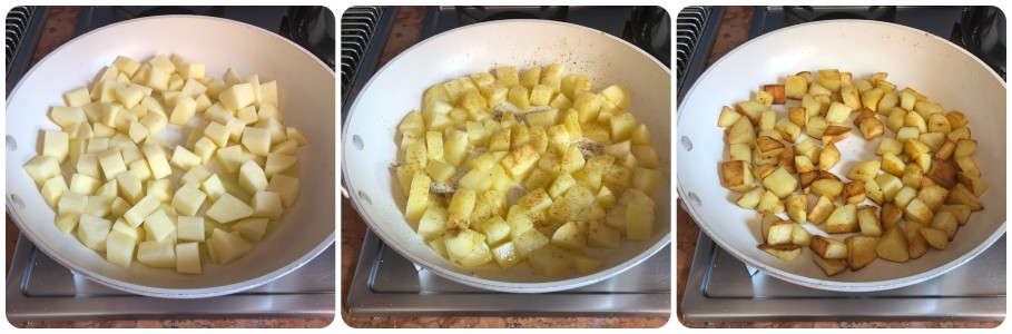 Verhit in een koekenpan een paar eetlepels olie, voeg dan de eerder uitgelekte en met een doek of keukenpapier gedroogde aardappelen toe. Breng op smaak naar wens en bak ze ongeveer tien minuten, regelmatig omscheppend. Als ze gaar zijn, moeten ze goudbruin zijn. Ik heb mijn smaakmaker voor aardappelen gebruikt, maar gewoon zout en peper is ook prima.
