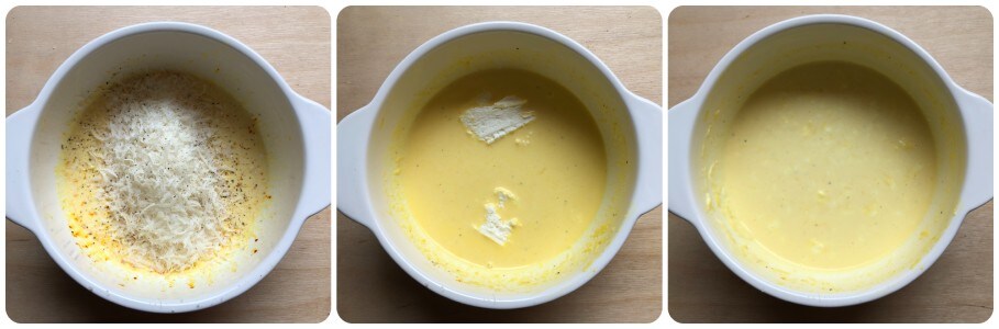 Voeg dan de geraspte pecorino, een snufje zout, een flinke draai van de pepermolen en de robiola toe en meng alles tot een glad en homogeen mengsel.