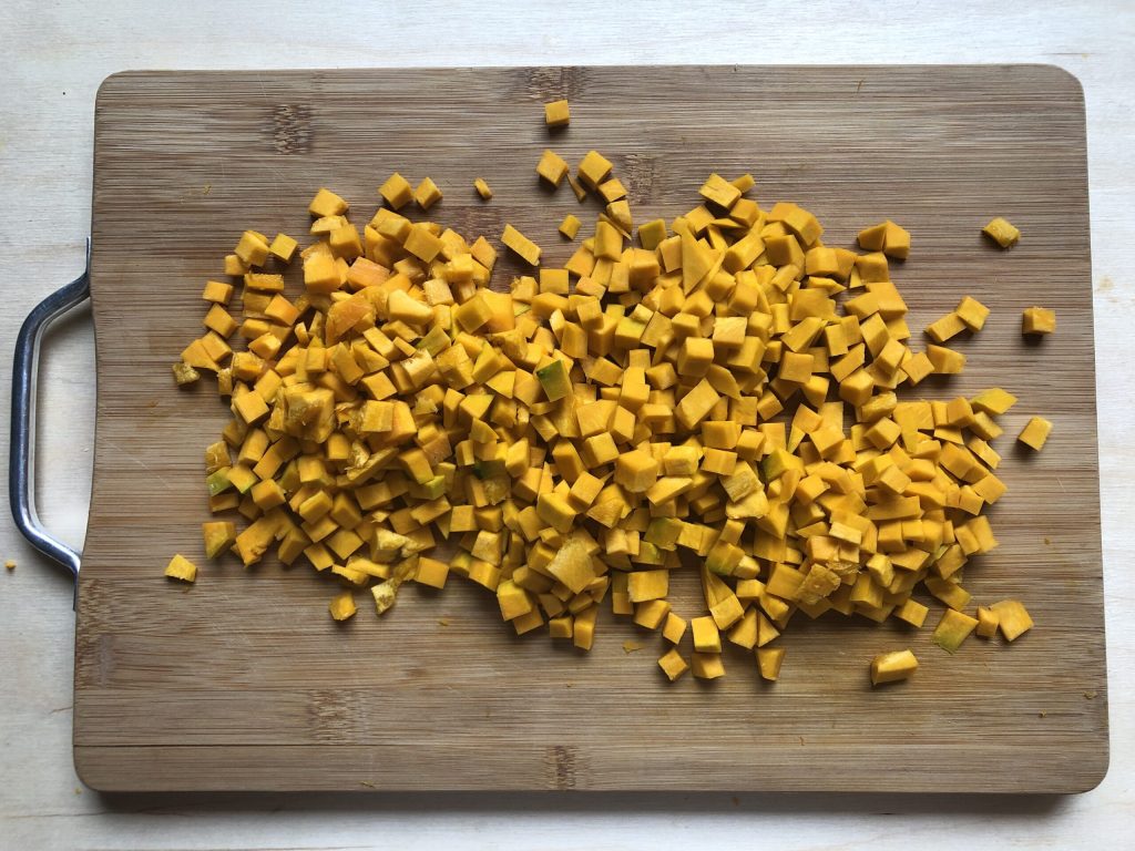 • Maak de pompoen schoon door de schil en alle zaden en draden te verwijderen. Gooi de schil niet weg, maar gebruik deze om smakelijke chips te maken. Het recept vind je door HIER te klikken.