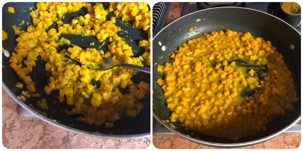 • Voeg vervolgens een soeplepel kokende bouillon toe, verlaag het vuur en ga verder met koken gedurende 10/15 minuten onder af en toe roeren. De pompoen moet zacht zijn, maar mag niet desintegreren, dus controleer de kooktijd, die kan variëren afhankelijk van de grootte van je blokjes, en voeg indien nodig meer bouillon toe.