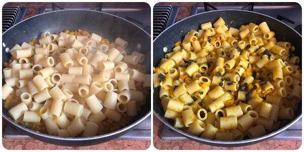 • Kook de mezze maniche in ruim gezouten kokend water, giet ze af al dente en bewaar wat van hun kookwater, en voeg ze toe aan de saus in de braadpan, meng goed om ze met de saus te vermengen.