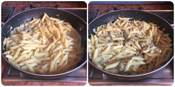 Kook ondertussen de pasta in ruim kokend gezouten water; giet ze al dente af en houd een beetje kookwater apart. Voeg de pasta direct toe aan de sauspan. Meng alle ingrediënten goed en als het nodig is, verzacht de saus met een paar eetlepels van het bewaarde kookwater. Laat op smaak komen door een paar momenten op het vuur te roeren.
