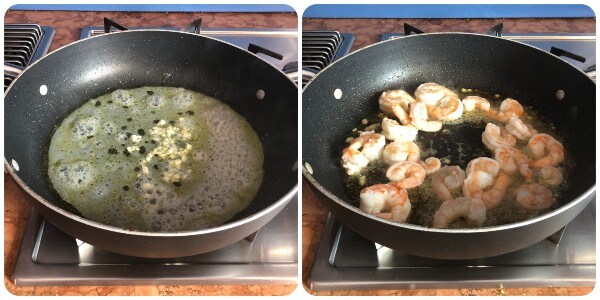 • Voeg de fijngehakte knoflookteen toe aan de bakresten van de Sint-jakobsschelpen en bak deze kort. Voeg dan de garnalen toe en bak ze op hoog vuur gedurende enkele minuten aan beide kanten. Haal ze daarna ook uit de braadpan.