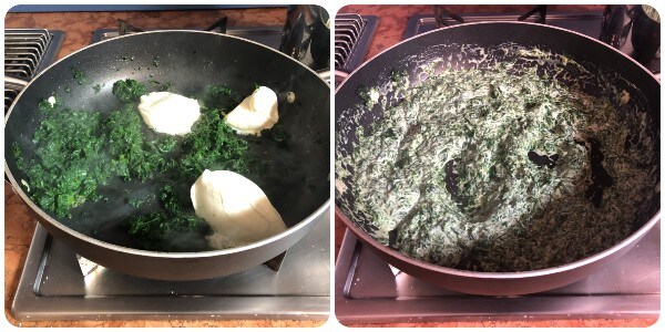 Voeg de smeerkaas toe aan de spinazie en verdun de saus met een beetje kookwater van de pasta, voeg het geleidelijk toe tot er een romige saus ontstaat. Verwijder de knoflook en breng op smaak met zout, indien nodig.