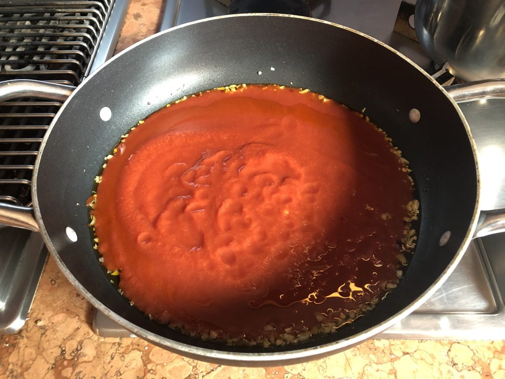 Laat het een paar seconden sudderen, voeg dan de tomatenpassata en een snufje baking soda toe en kook op matig vuur gedurende ongeveer tien minuten, af en toe roerend.