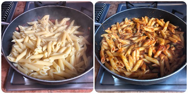 Bereiding van de pennette met kappertjes en zwarte olijven
