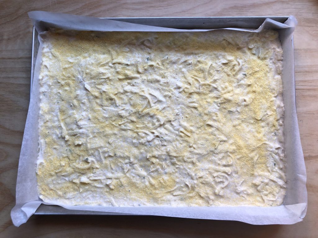• Bekleed een grote bakplaat met bakpapier (de mijne is 39 × 29 cm, maar groter kan ook), besmeer het papier met een beetje olie en giet het mengsel erin en strijk het goed glad.